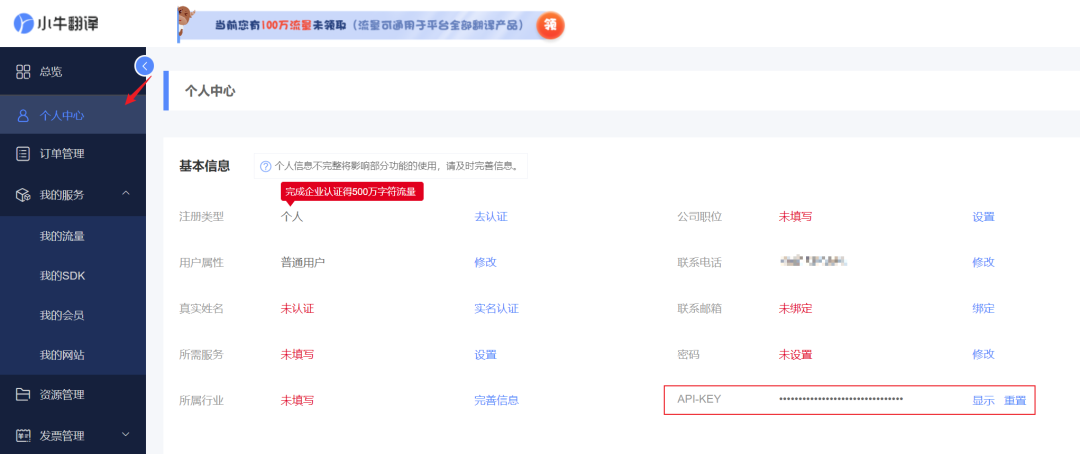 登录后,在左侧栏目点击“个人中心”,可以看到“基本信息”中有一项“API-KEY”,点击“显示”按钮就可以显示密钥了,复制该密钥;