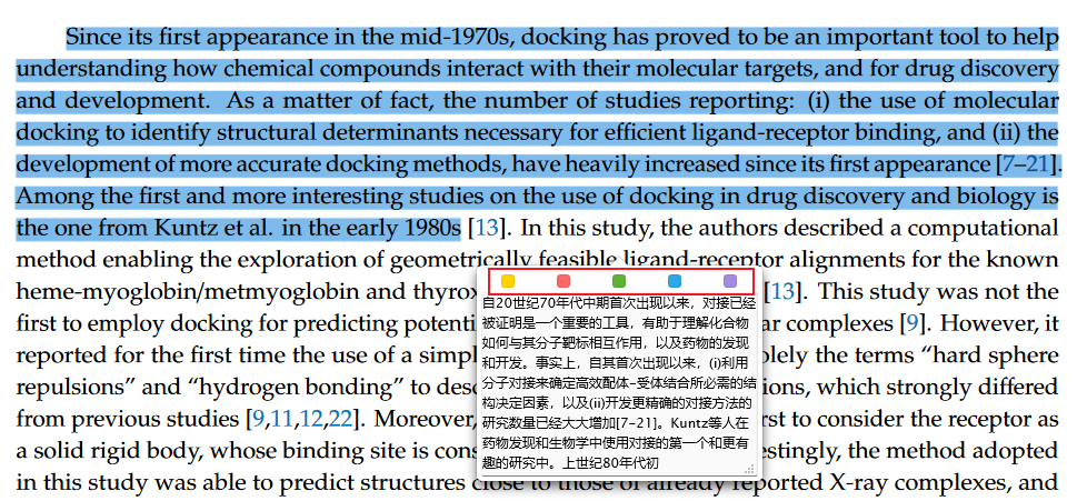 此外,选中文本后,在翻译弹窗的上方可以以不同的颜色添加注释,注释内容也会自动添加翻译结果。