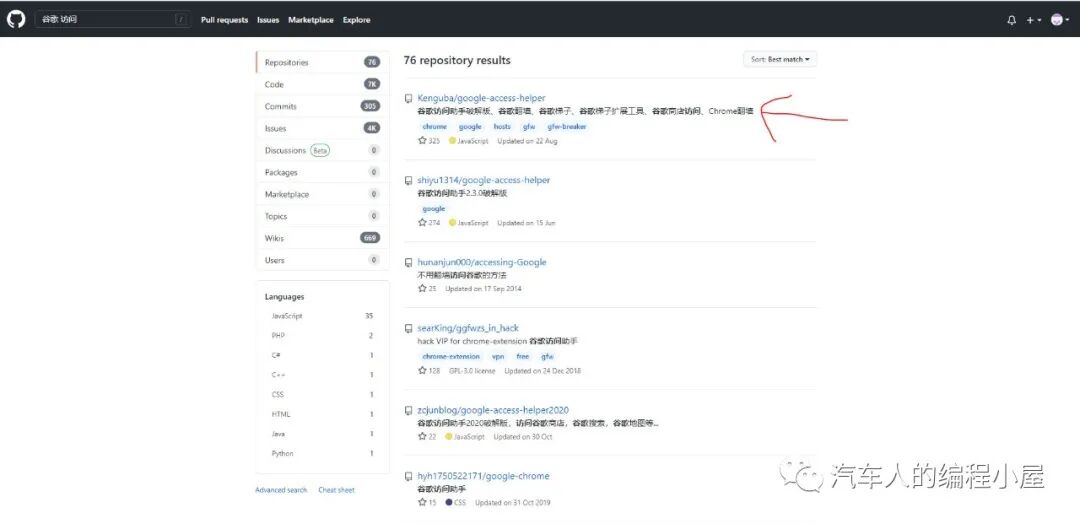 我们都知道,有个工具叫“谷歌浏览助手”,但是百度总会推送一些坑壁的搜索结果,所以我们上GitHub找。